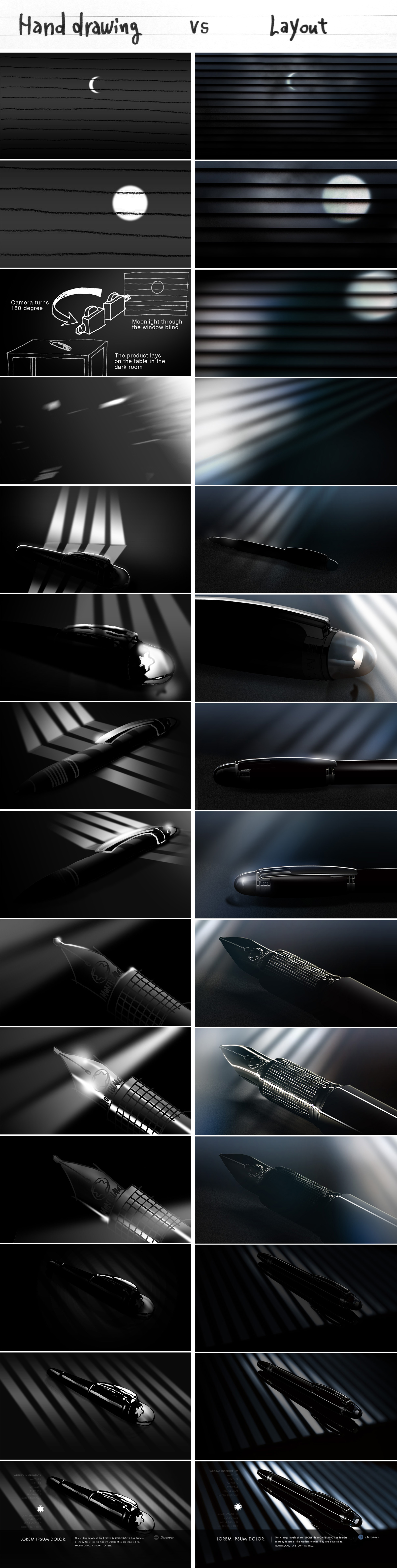 Here is a comparison of storyboard and layout. The storyboard is already very precise and illustrates the tonality, camera switching, how the product is to be shown and suggests the movement of light on the product.